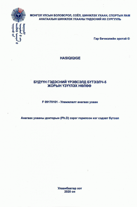 | PhD дирссертаци | Эрдэм шинжилгээний номын сан Эрдэм шинжилгээний уншлагын танхим | 615.882 H-33 | Available | 2020.09.04 | 2022.09 | 2023.09.18 | 2024.02.15 | ATNS-PHD00255 |