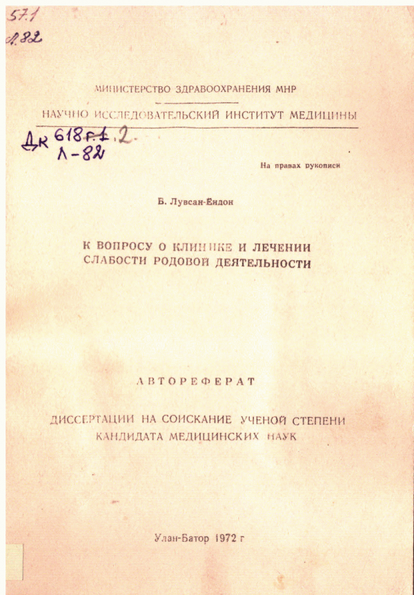 К Вопросу о клинике и лечении слабости родовой деятельности: Автореферат диссертации на соискание ученой степени кандидата медицинских наук / Науч. рук. д-р мед. наук, проф. И.И.Грищенко, канд. мед. наук М.Дамбадорж; Офиц. опп. канд. мед. наук Б.Жав, канд. мед. наук Б.Лувсанноров.