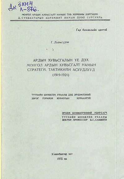 Ардын хувьсгалын үе дэх МАХН-ын стратеги, тактикийн асуудлууд (1919 - 1921): Түүхийн шинжлэх ухааны дэд эрдэмтэний зэрэг горилох зохиолын хураангуй / Э/Ш-ний удирд. түүхийн шинжлэх ухааны д-р, проф. Б.С. Санжиев; Шүүмж. түүхийн шинжлэх ухааны д-р Г. Дэлэг, түүхийн шинжлэх ухааны дэд эрдэмтэн А. Маамуу.
