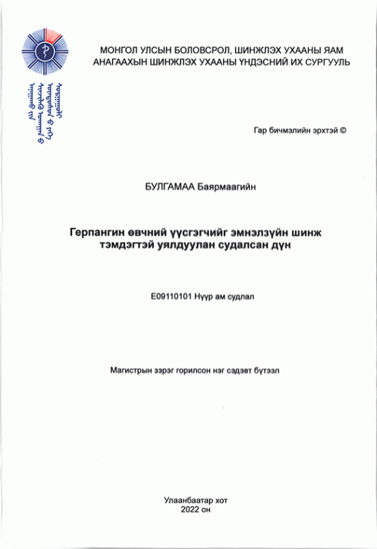 Герпангин өвчний үүсгэгчийг эмнэлзүйн шинж тэмдэгтэй уялдуулан судалсан дүн: Магистрын зэрэг горилсон нэг сэдэвт бүтээл: Е09110101-Нүүр ам судлал /Э/ш-ний удирд. АУ-ны д-р, дэд проф. Ж.Үржинлхам; Э/ш-ний зөвл. АУ-ны д-р Б.Ичинхорлоо; Э/ш-ний шүүмж. АУ-ны д-р Б.Цэлмэг.