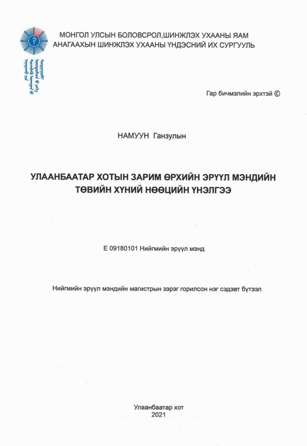 Улаанбаатар хотын зарим өрхийн эрүүл мэндийн төвийн хүний нөөцийн үнэлгээ: НЭМ-ийн магистрын зэрэг горилсон нэг сэдэвт бүтээл: Е09180101-Нийгмийн эрүүл мэнд /Э/ш-ний удирд. Төрийн бодлогын д-р Л.Хоролсүрэн; Э/ш-ний зөвл. АУ-ны д-р, проф. Д.Даваалхам; Э/ш-ний шүүмж. АУ-ны д-р, дэд проф. Б.Цэнгэлмаа.