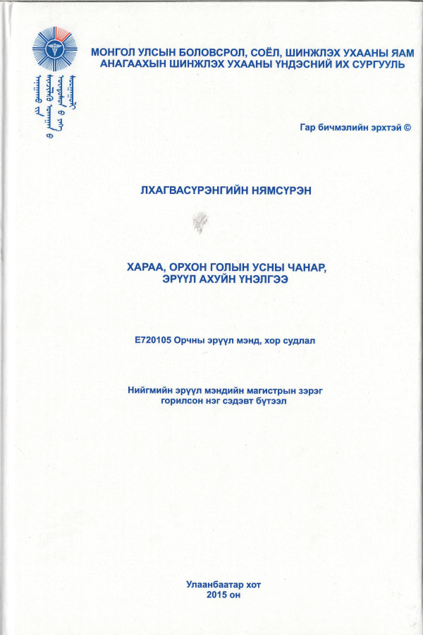 Хараа, Орхон голын усны чанар, эрүүл ахуйн үнэлгээ : Нийгмийн эрүүл мэндийн магистрын зэрэг горилсон нэг сэдэвт бүтээл : E720105 - Орчны эрүүл мэнд, хор судлал /Э/ш-ний удирд. АУ-ны д-р И.Болормаа ; Э/ш-ний зөвл. АУ-ны д-р, дэд проф. Э.Эрдэнэчимэг ; ЭШ-ний шүүмж. АУ-ны д-р Б.Ичинхорлоо.