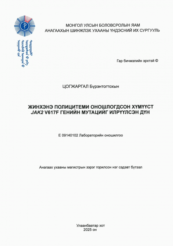 Жинхэнэ полицитеми оношлогдсон хүмүүст JAK2 V617F генийн мутацийг илрүүлсэн дүн: Анагаах ухааны агистрын зэрэг горилсон нэг сэдэвт бүтээл : E09140102 - Лабораторийн оношилгоо/ Эрдэм шинжилгээний ажлын удирдагч : Анагаах ухааны доктор Ж. Саранцэцэг; Зөвлөх: Анагаах ухааны доктор, профессор Ц. Одгэрэл; Шүүмжлэгч : Анагаах ухааны доктор Ц. Дүүрэнжаргал.