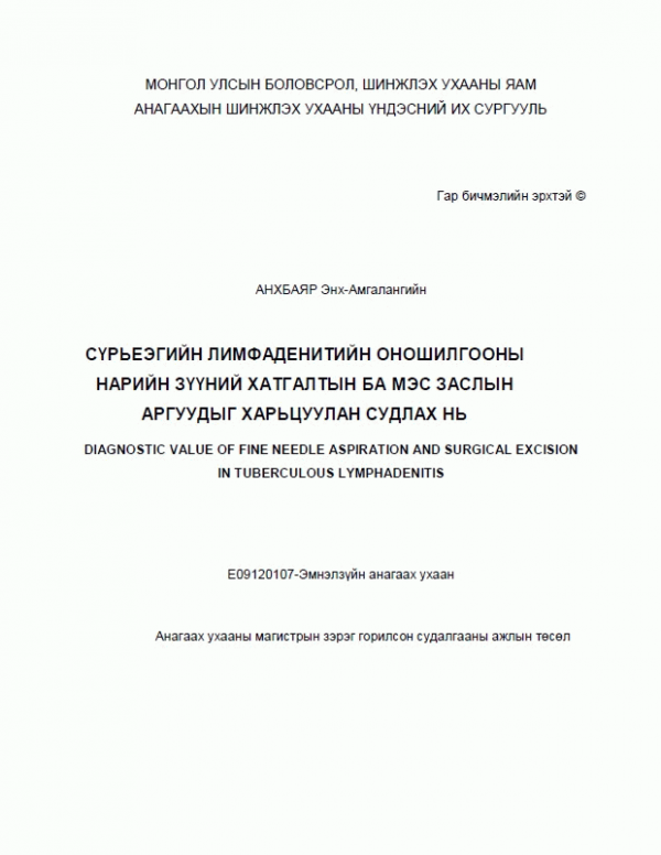 Сүрьеэгийн лимфаденитийн оношилгооны нарийн зүүний хатгалтын ба мэс заслын аргуудыг харьцуулан судлах нь = Diagnostic value of fine needle aspiration and surgical excision in tuberculous lymphadenitis: Анагаах ухааны магистрын зэрэг горилсон судалгааны ажлын төсөл: Е09120107-Эмнэлзүйн анагаах ухаан /Судлаач: Энх-Амгалангийн Анхбаяр; Судалгааны төслийн удирдагч: Анагаах ухааны доктор, дэд профессор А. Шийрэвнямба; Судалгааны төслийн албан ёсны шүүмжлэгч: Анагаах ухааны доктор, дэд профессор А. Аварзэд.