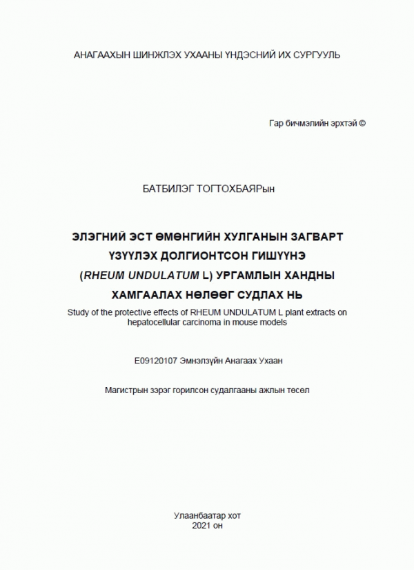 Элэгний эст өмөнгийн хулганын загварт үзүүлэх долгионтсон гишүүнэ (RHEUM UNDULATUM L) ургамлын хандны хамгаалах нөлөөг судлах нь = Study of the protective effects of RHEUM UNDULATUM L plant extracts on hepatocellular carcinoma in mouse models: Магистрын зэрэг горилсон судалгааны ажлын төсөл: E09120107 Эмнэлзүйн Анагаах Ухаан /Судлаач: Тогтохбаярын Батбилэг; Судалгааны төслийн удирдагч: Анагаах ухааны доктор М. Адилсайхан.
