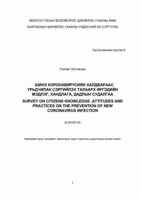Уртнасан Г., Хоролсүрэн Л. & Анагаахын Шинжлэх Ухааны Үндэсний Их Сургууль. (2021). Шинэ коронавирүсийн халдвараас урьдчилан сэргийлэх талаарх иргэдийн мэдлэг, хандлага, дадлын судалгаа = Survey on citizens knowledge, attitudes and practices on the prevention of new coronavirus infection. Улаанбаатар: [Хэвлэлийн газар тодорхойгүй].