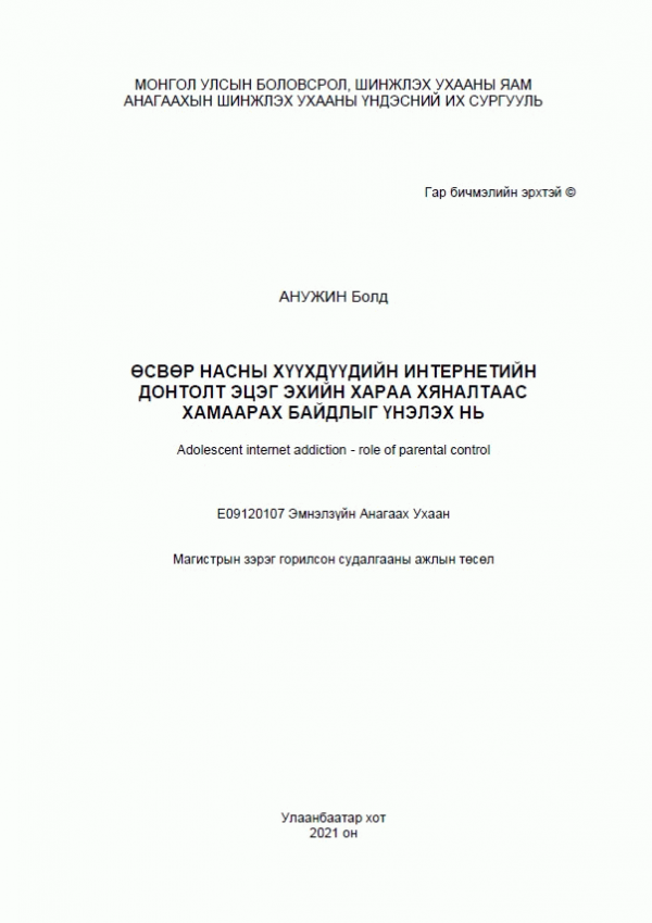 Өсвөр насны хүүхдүүдийн интернетийн донтолт эцэг эхийн хараа хяналтаас хамаарах байдлыг үнэлэх нь = Adolescent internet addiction - role of parental control: Магистрын зэрэг горилсон судалгааны ажлын төсөл: E09120107 Эмнэлзүйн Анагаах Ухаан /Судлаач: Болдын Анужин; Судалгааны төслийн удирдагч: Анагаах ухааны доктор Г. Баясгалан; Судалгааны төслийн албан ёсны шүүмжлэгч: Анагаах ухааны доктор, дэд профессор З. Хишигсүрэн.