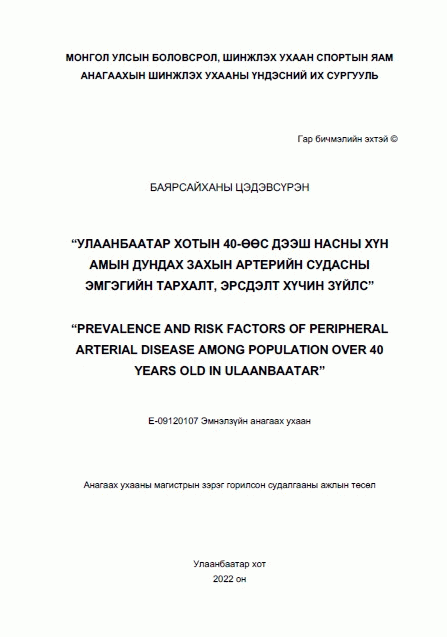 Цэдэвсүрэн Баярсайханы, Бурмаа Б, Гантуяа Д and Анагаахын Шинжлэх Ухааны Үндэсний Их Сургууль. Улаанбаатар хотын 40-өөс дээш насны хүн амын дундах захын артерийн судасны эмгэгийн тархалт, эрсдэлт хүчин зүйлс = Prevalence and risk factors of peripheral arterial disease among population over 40 years old in Ulaanbaatar. Улаанбаатар: [Хэвлэлийн газар тодорхойгүй]. 2022.