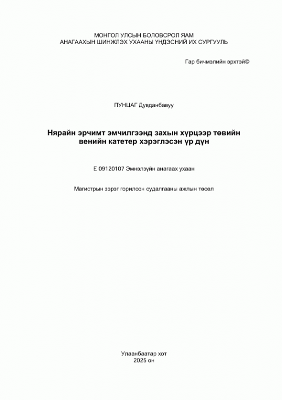 Пунцаг Д., Баясгалантай Б., Алтантуяа Ц. & Анагаахын Шинжлэх Ухааны Үндэсний Их Сургууль. (2025). Нярайн эрчимт эмчилгээнд захын хүрцээр төвийн венийн катетер хэрэглэсэн үр дүн. Улаанбаатар: [Хэвлэлийн газар тодорхойгүй].