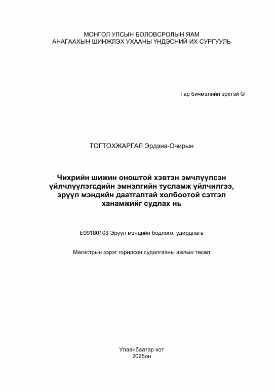 Тогтохжаргал Эрдэнэ-Очирын, Цэдэн П, Гантуяа Д and Анагаахын Шинжлэх Ухааны Үндэсний Их Сургууль. Чихрийн шижин оноштой хэвтэн эмчлүүлсэн үйлчлүүлэгсдийн эмнэлгийн тусламж үйлчилгээ, эрүүл мэндийн даатгалтай холбоотой сэтгэл ханамжийг судлах нь. Улаанбаатар: [Хэвлэлийн газар тодорхойгүй]. 2025.