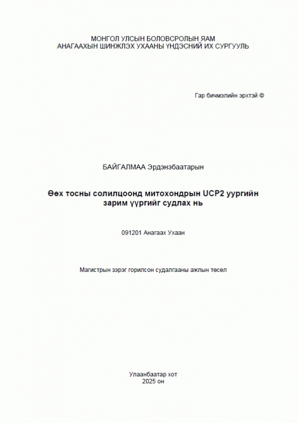 Байгалмаа Э., Цэрэндагва Д., Үүртуяа Ш. & Анагаахын Шинжлэх Ухааны Үндэсний Их Сургууль. (2025). Өөх тосны солилцоонд митохондрын UCP2 уургийн зарим үүргийг судлах нь. Улаанбаатар: Эрхэс.