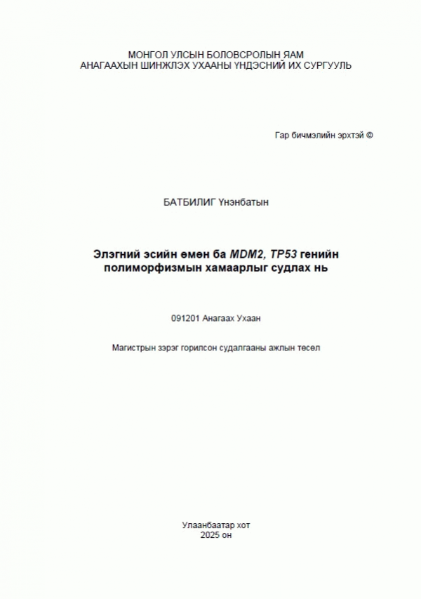Батбилиг Ү., Шийрэвнямба А., Үүртуяа Ш. & Анагаахын Шинжлэх Ухааны Үндэсний Их Сургууль. (2025). Элэгний эсийн өмөн ба MDM2, TP53 генийн полиморфизмын хамаарлыг судлах нь. Улаанбаатар: Эрхэс.