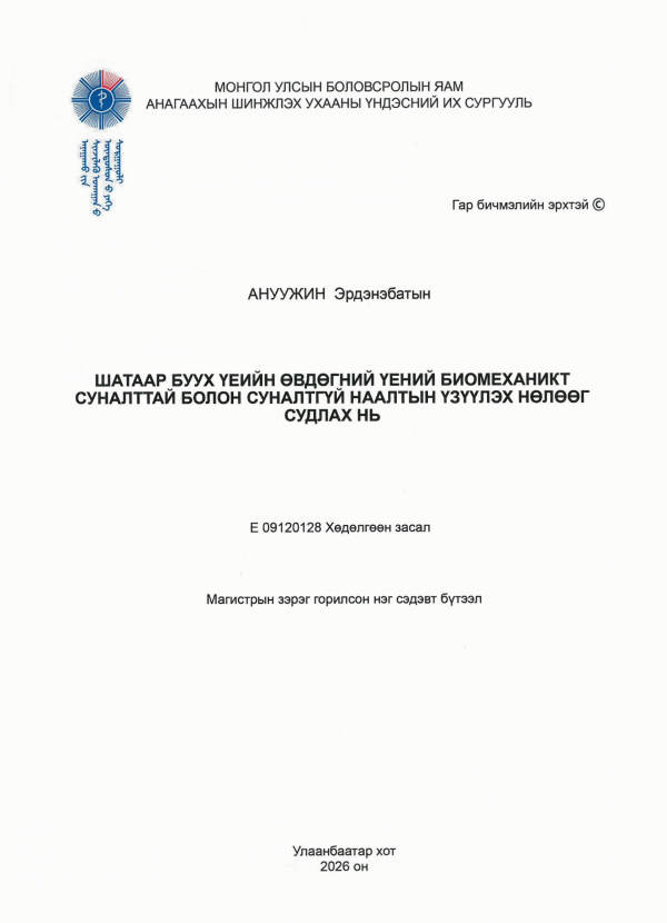 Шатаар буух үеийн өвдөгний үений биомеханикт суналттай болон суналтгүй наалтын үзүүлэх нөлөөг судлах нь: Магистрын зэрэг горилсон нэг сэдэвт бүтээл: Е09120128-Хөдөлгөөн засал / Судлаач: Эрдэнэбатын Ануужин; Эрдэм шинжилгээний ажлын удирдагч: Анагаах ухааны доктор Д. Батлхам; Зөвлөх: Анагаах ухааны доктор, дэд профессор Б. Мөнх-Эрдэнэ; Шүүмжлэгч: Анагаах ухааны доктор Б. Янжинсүрэн.