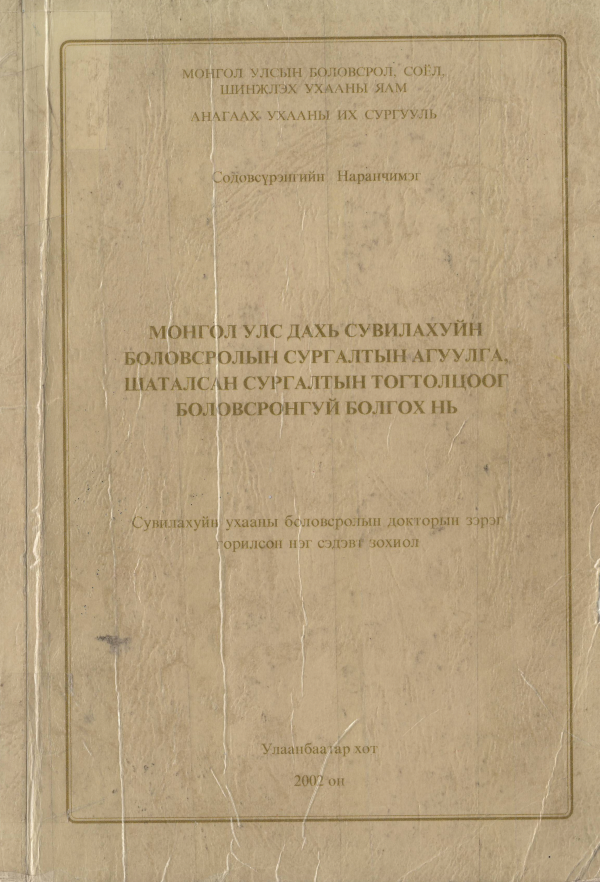 | PhD дирссертаци | Эрдэм шинжилгээний номын сан Эрдэм шинжилгээний уншлагын танхим | 610.73 | Available | 2017.06.19 | 2019.06.18 | 2020.09.09 | 2022.09 | 2023.09.18 | 2024.02.15 | ATNS-PHD00146 |