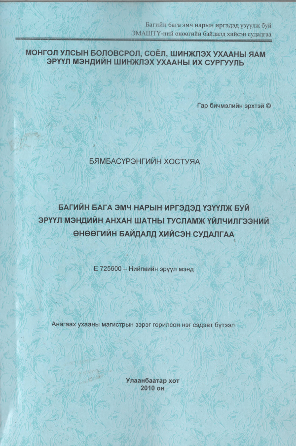 Багийн бага эмч нарын иргэдэд үзүүлж буй эрүүл мэндийн анхан шатны тусламж үйлчилгээний өнөөгийн байдалд хийсэн судалгаа : АУ-ны магистрын зэрэг горилсон нэг сэдэвт бүтээл : Е 725600 - Нийгмийн эрүүл мэнд / Э/ш-ний удирд. Фил.У-ны д-р, дэд проф. Х.Дамдинжав ; Э/ш-ний шүүмж. АУ-ны д-р Л.Оюунтогос.