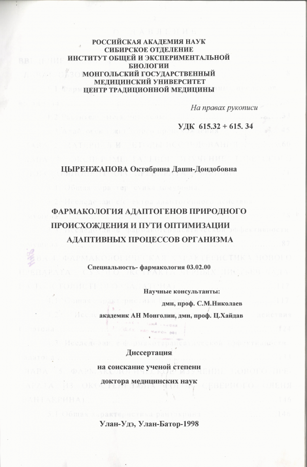 (Российская Академия Наук Сибирское Отделение, Институт Общей и Экспериментальной Биологии, Монгольский Государственный Медицинский Университет, Центр Традционной Медицины)