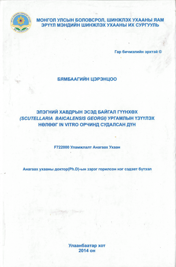 Элэгний хавдрын эсэд байгал гүүнхөх (SCUTELLARIA BAICALENSIS GEORGI) ургамлын үзүүлэх нөлөөг in vitro орчинд судалсан дүн: Анагаах ухааны доктор (PhD) -ын зэрэг горилсон нэг сэдэвт бүтээл: F722000 - Уламжлалт анагаах ухаан / Э/ш-ний удирд. МАУА-ын гишүүн Акад. АУ-ны д-р, проф. Д.Цэрэндагва, ЭмЗУ-ны д-р, проф. Т.Зориг; Э/ш-ний зөвл. МАУА-ын гишүүн, Акад. АШУ-ны д-р, проф. Б.Дагвацэрэн; Э/ш-ний шүүмж. АШУ-ны д-р, проф. М.Амбага, АУ-ны д-р, проф. С.Цогтсайхан.