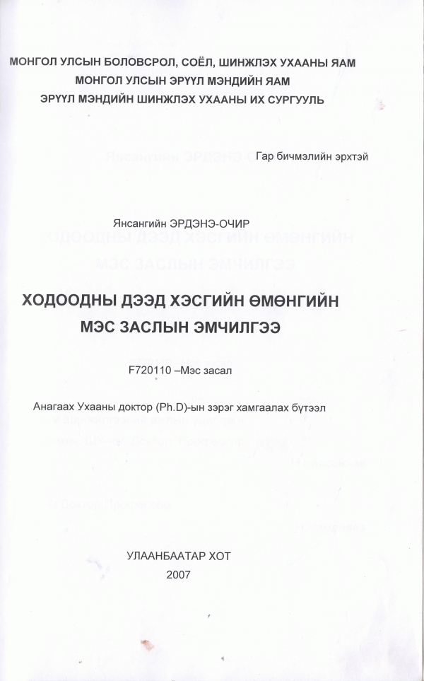 Ходоодны дээд хэсгийн өмөнгийн мэс заслын эмчилгээ: Анагаах ухааны докторын (PhD) зэрэг горилсон нэг сэдэвт бүтээл: F720110 - Мэс засал / Э/ш-ний удирд. Акад. АШУ-ны д-р, проф. Н.Баасанжав, АУ-ны д-р, проф. Н.Нямдаваа.