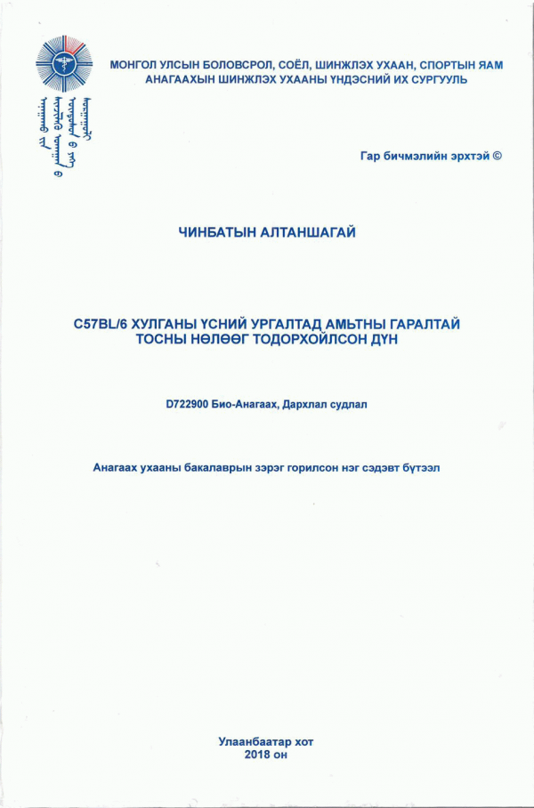 C57BL/6 хулганы үсний ургалтад амьтны гаралтай тосны нөлөөг тодорхойлсон дүн: АУ-ны бакалаврын зэрэг горилсон нэг сэдэвт бүтээл: D722900-Био-Анагаах, Дархлаа судлал / Э/ш-ний удирд. БУ-ны д-р Б.Галиндэв; Э/ш-ний зөвл. АУ-ны д-р С.Мөнхбаяр; Э/ш-ний шүүмж. АУ-ны д-р А.Долгорсүрэн.