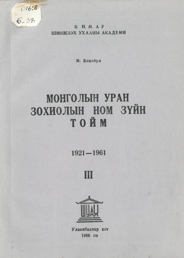 Баянзул Магсарын, Дашдорж Ж and Шинжлэх Ухааны Академи. 1966. Монголын уран зохиолын ном зүйн тойм 1921-1961. Улаанбаатар: Шинжлэх Ухааны Академийн хэвлэх үйлдвэр.