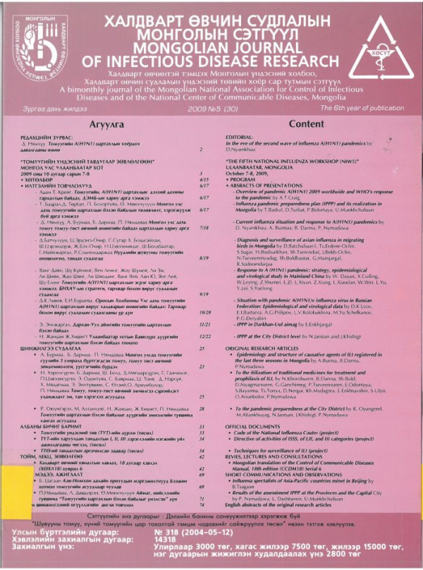 Халдварт өвчинтэй тэмцэх Монголын үндэсний холбоо, Нямдаваа П, Нямхүү Д and Энхбаатар Л. 2009. Халдварт өвчин судлалын Mонголын сэтгүүл= Mongolian journal of infectious disease research. Улаанбаатар: .