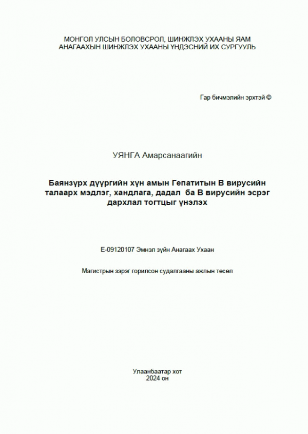 Уянга Амарсанаагийн, Бира Н, Бадамсүрэн Д and Анагаахын Шинжлэх Ухааны Үндэсний Их Сургууль. 2024. Баянзүрх дүүргийн хүн амын Гепатитын В вирусийн талаарх мэдлэг, хандлага, дадал ба В вирусийн эсрэг дархлал тогтцыг үнэлэх. Улаанбаатар: .