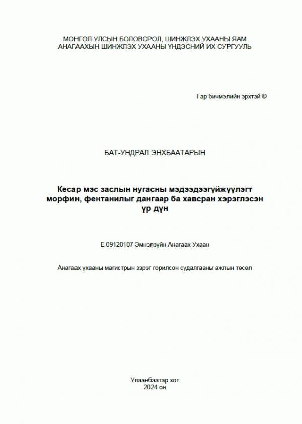 Кесар мэс заслын нугасны мэдээдээгүйжүүлэгт морфин, фентанилыг дангаар ба хавсран хэрэглэсэн үр дүн: Анагаах ухааны магистрын зэрэг горилсон судалгааны ажлын төсөл: E09120107 Эмнэлзүйн Анагаах Ухаан / Судлаач: Аззаяа, Чулуунбатын; Судалгааны төслийн удирдагч: Анагаах ухааны доктор, Клиникийн профессор Ё. Бямбасүрэн; Судалгааны төслийн албан ёсны шүүмжлэгч: Анагаах ухааны доктор, профессор Л. Ганболд.