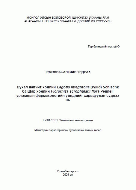 Бүхэл навчит хонлин Lagotis integrifolia (Willd) Schischk ба Шар хонлин Picrorhiza scrophularii flora Pennell ургамлын фармакологийн үйлдлийг харьцуулан судлах нь: Магистрын зэрэг горилсон судалгааны ажлын төсөл: E09170101 Уламжлалт Анагаах Ухаан / Судлаач: Ундрах, Түмэннасангийн; Судалгааны ажлын төслийн зөвлөх багш: Анагаах ухааны доктор, дэд профессор Б. Дэжидмаа; Судалгааны ажлын төслийн албан ёсны шүүмжлэгч : Анагаах ухааны доктор, дэд профессор Б. Цэрэнцоо.