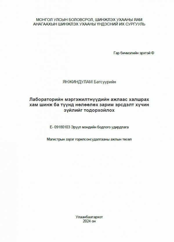 Лабораторийн мэргэжилтнүүдийн ажлаас халшрах хам шинж ба түүнд нөлөөлөх зарим эрсдэлт хүчин зүйлийг тодорхойлох: Магистрын зэрэг горилсон судалгааны ажлын төсөл: E09180103 - Эрүүл мэндийн бодлого удирдлага / Судлаач: Янжиндулам, Батсуурийн; Судалгааны төслийн удирдагч: Анагаах ухааны доктор, дэд профессор Ш.Үүртуяа; Судалгааны төслийн албан ёсны шүүмжлэгч: Анагаах ухааны доктор Э. Оюунчимэг.