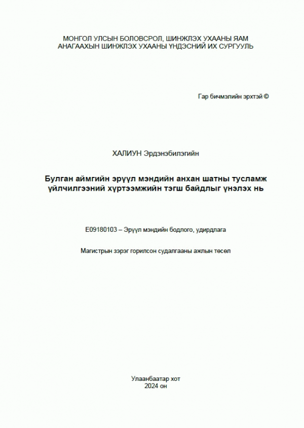 Булган аймгийн эрүүл мэндийн анхан шатны тусламж үйлчилгээний хүртээмжийн тэгш байдлыг үнэлэх нь: Магистрын зэрэг горилсон судалгааны ажлын төсөл: E09180102 - Орчин Хөдөлмөрийн Эрүүл Мэнд / Судлаач: Халиун, Эрдэнэбилэгийн; Судалгааны төслийн удирдагч: ТБУ-ын доктор, дэд профессор Л. Хоролсүрэн; Судалгааны төслийн албан ёсны шүүмжлэгч: Анагаах ухааны доктор, дэд профессор Ц. Билэгтсайхан.