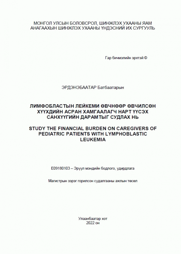 Эрдэнэбаатар Батбаатарын, Мөнх-Эрдэнэ Л, Чимэдсүрэн О and Анагаахын Шинжлэх Ухааны Үндэсний Их Сургууль. Лимфобластын лейкеми өвчнөөр өвчилсөн хүүхдийн асран хамгаалагч нарт үүсэх санхүүгийн дарамтыг судлах нь = Study the financial burden on caregivers of pediatric patients with lymphoblastic leukemia. Улаанбаатар: [Хэвлэлийн газар тодорхойгүй]. 2022.