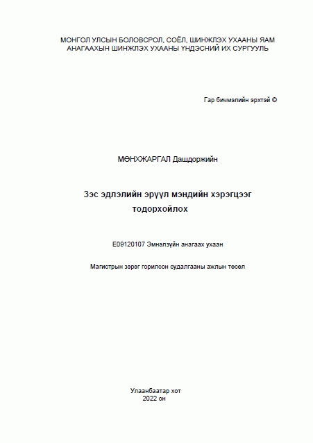 Мөнхжаргал Дашдоржийн, Баасанжаргал Б and Анагаахын Шинжлэх Ухааны Үндэсний Их Сургууль. 2022. Зэс эдлэлийн эрүүл мэндийн хэрэгцээг тодорхойлох. Улаанбаатар: [Хэвлэлийн газар тодорхойгүй].