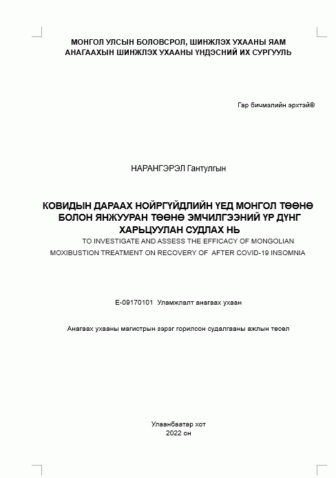 Нарангэрэл Гантулгын, Байгалмаа Ж, Сарнай Ц and Анагаахын Шинжлэх Ухааны Үндэсний Их Сургууль. Ковидын дараах нойргүйдлийн үед монгол төөнө болон янжууран төөнө эмчилгээний үр дүнг харьцуулан судлах нь = TO INVESTIGATE AND ASSESS THE EFFICACY OF MONGOLIAN MOXIBUSTION TREATMENT ON RECOVERY OF AFTER COVID-19 INSOMNIA. Улаанбаатар: [Хэвлэлийн газар тодорхойгүй]. 2022.