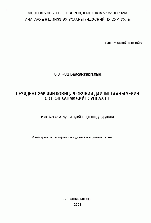 Сэр-Од Баасанжаргалын, Түвшинжаргал Ц and Анагаахын Шинжлэх Ухааны Үндэсний Их Сургууль. Резидент эмчийн ковид-19 өвчний дайчилгааны үеийн сэтгэл ханамжийг судлах нь. Улаанбаатар: [Хэвлэлийн газар тодорхойгүй]. 2021.