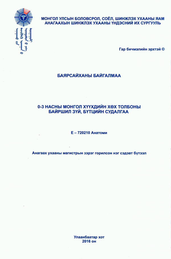 0-3 насны монгол хүүхдийн хөх толбоны байршил зүй, бүтцийн судалгаа: АУ-ны магистрын зэрэг горилсон нэг сэдэвт бүтээл: E720210 - Анатоми / Э/ш-ний удирд. АУ-ны д-р, дэд проф. А.Авирмэд; Э/ш-ний зөвл. Акад. АШУ-ны д-р, дэд проф. Д.Амгаланбаатар; Э/ш-ний шүүмж. АУ-ны д-р, дэд проф. Э.Баярмаа.