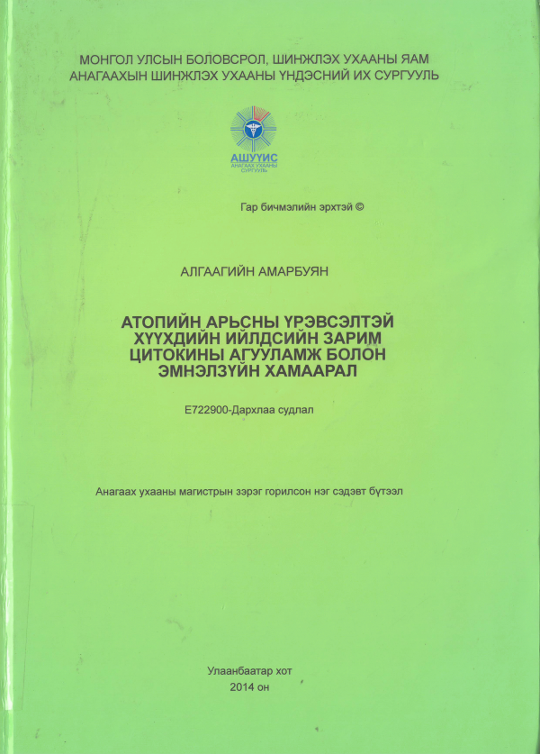 Атопийн арьсны үрэвсэлтэй хүүхдийн ийлдсийн зарим цитокины агууламж болон эмнэлзүйн хамаарал: АУ-ны магистрын зэрэг горилсон нэг сэдэвт бүтээл: Е722900 - Дархлаа судлал / Э/ш-ний удирд. АУ-ны д-р Ц.Түвшинжаргал; Э/ш-ний зөвл. АУ-ны д-р, проф. С.Цогтсайхан; Э/ш-ний шүүмж. АУ-ны д-р Я.Энхтөр.