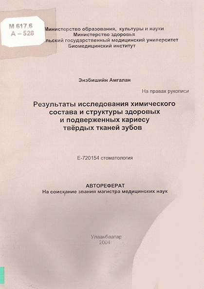 Результаты исследования химического состава и структуры здоровых и подверженных кариесу твёрдых тканей зубов: Тезис на соискание звания магистра медицинских наук: Е720154 - Стоматология / Научный руководитель канд. хим. наук, проф. Н. Даваасүрэн; Научный консультант канд. мед. наук Б. Амарсайхан; Официальный оппонент канд. мед. наук, проф. Н. Пүрэвжав.