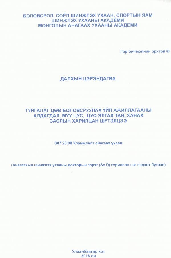 Тунгалаг цөв боловсруулах үйл ажиллагааны алдагдал, муу цус, цус ялгах тан, ханах заслын харилцан шүтэлцээ: АШУ-ны докторын зэрэг (ScD) горилсон нэг сэдэвт бүтээл: S07.28.00 - Уламжлалт анагаах ухаан / Э/ш-ний зөвл. Акад. АШУ-ны д-р, проф. Ц.Лхагвасүрэн, АШУ-ны д-р, проф. М.Амбага; Э/ш-ний шүүмж. Акад. АШУ-ны д-р, проф. Б.Оргил, Акад. АШУ-ны д-р, проф. Б.Дагданбазар, Акад. АШУ-ны д-р, проф. Б.Дагвацэрэн. by