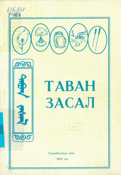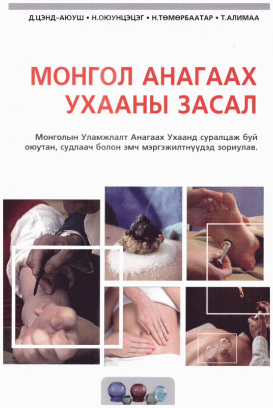 Монгол анагаах ухааны засал: Монголын уламжлалт анагаах ухаанд суралцаж буй оюутан, судлаач болон эмч мэргэжилтнүүдэд зориулав /Зохиогч: Н. Оюунцэцэг, Д. Цэнд-Аюуш, Н. Төмөрбаатар, Т. Алимаа; Хянан тохиолдуулсан: Д. Цэрэндагва; Рецензент: С. Олдох. by