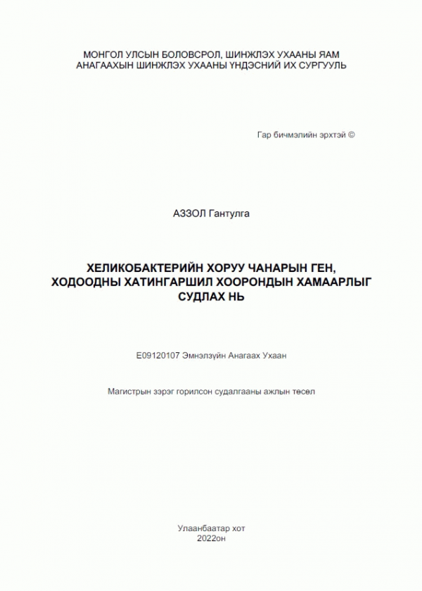Өтгөнд Helicobacter pylori-ийн антиген илрүүлэх хурдавчилсан оношлуурыг ПГУ-ын шинжилгээтэй харьцуулсан дүн // by